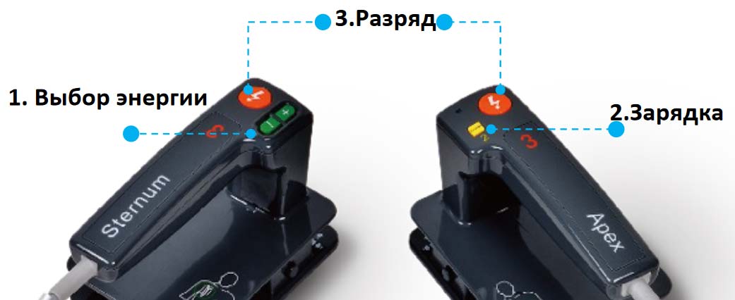 Управление зарядкой дефибриллятора на передней панели прибора, на рукоятках электродов