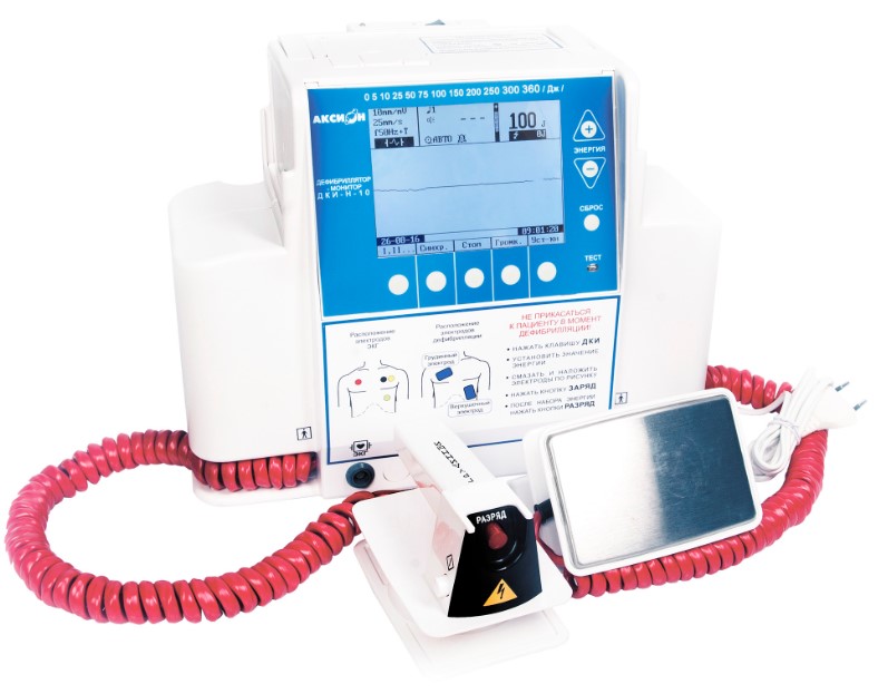 Дефибриллятор-монитор ДКИ-Н-10 Аксион с расширенной комплектацией (модель: ЮМГИ.941135.007) предназначен для лечебного воздействия на сердце человека одиночным биполярным электрическим импульсом посредством пары электродов трансторакально