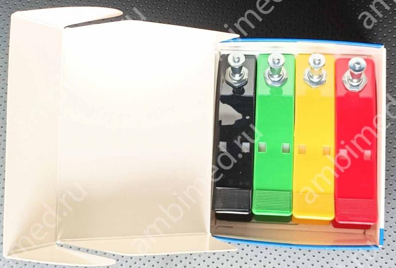 Конечностные электроды различаются цветными скобами-захватами (красные, желтые, зеленые, черные), при помощи которых они крепятся на конечности пациента