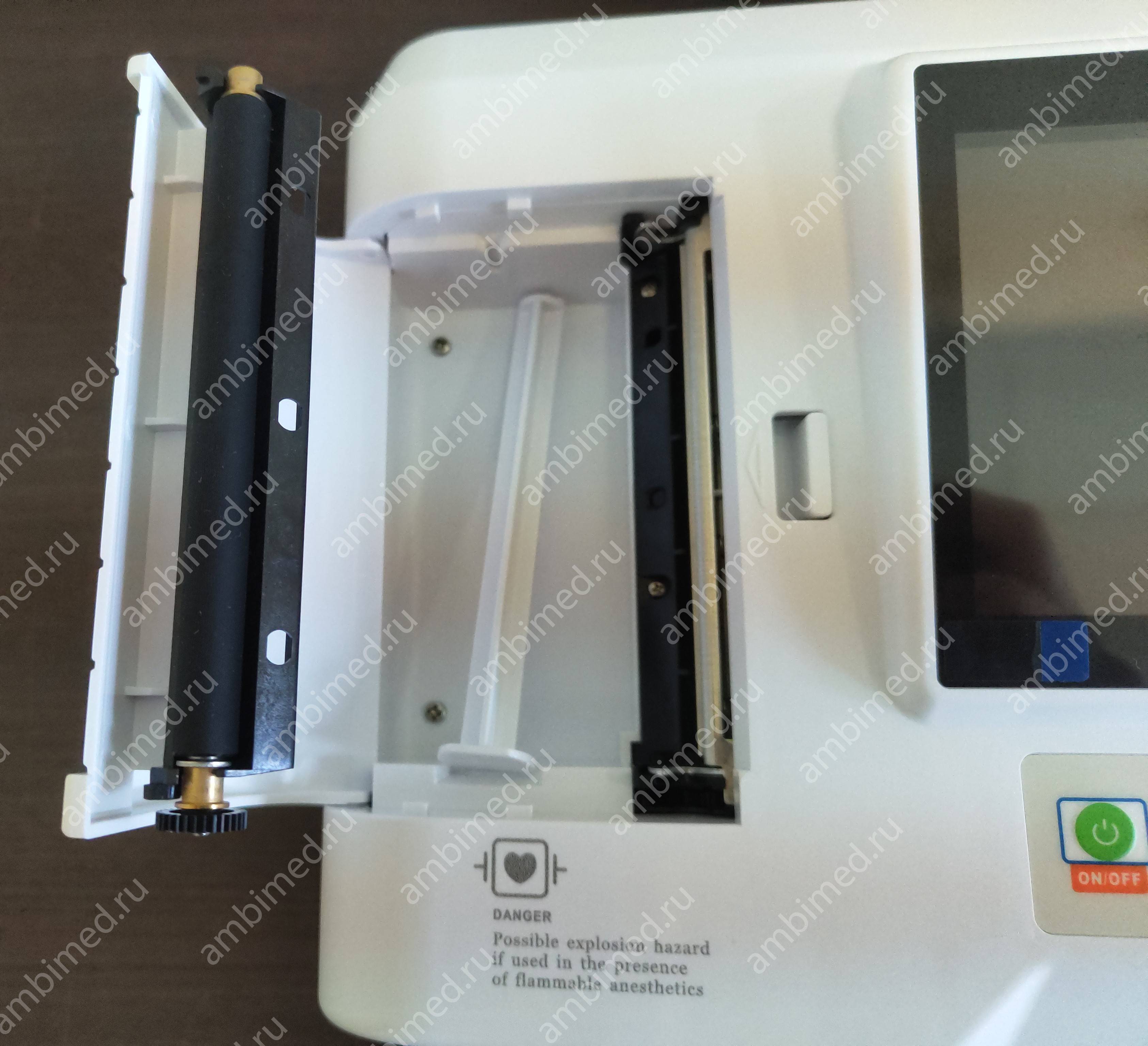 • В корпус прибора встроен термопринтер с отсеком для рулона бумаги шириной 110 мм. Частота записи принтера до 150 Гц, разрешение 8 точек на кв. мм.