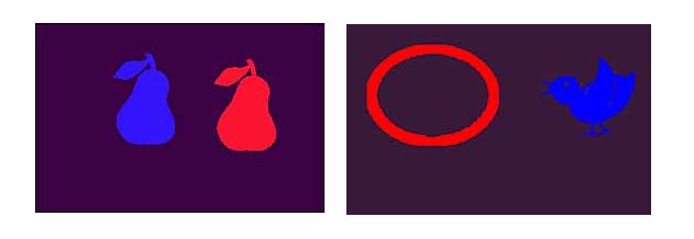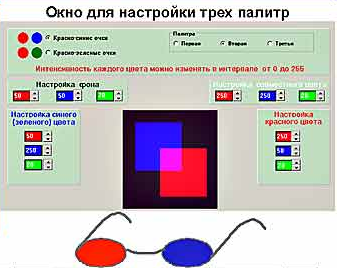Для разделения левого и правого полей зрения используются красно-синие очки