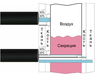 Коэффициент отражения ультразвука сильно отличается для различных границ раздела. На границе «кость/воздух происходит полное отражение ультразвука. На границе «кость/содержимое пазухи» происходит частичное отражение ультразвука, а часть ультразвуковой энергии проходит через границу и распространяется в жидкости, например, в жидком содержимом гайморовой пазухи.